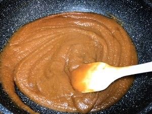 炒至枣泥完全吸收了花生油,最后倒入麦芽糖,开小火继续炒。