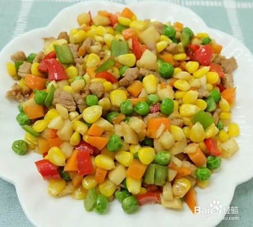 然后在锅里放入少量花生油,锅热后把青豆子、红萝卜、玉米粒放进去翻炒1~2分钟,加入少量的青水,继续翻炒五分钟;加入炒过的瘦肉、青红辣椒继续翻炒1分种,加入葱花、适量的盐和酱油。就可以出锅罗