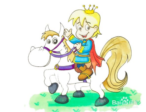 最后用紫色涂白马的缰绳,毛发和尾巴用土黄色涂,马蹄用深灰色涂,地面用绿色涂,画出小草的感觉,一幅白马王子就画好了。