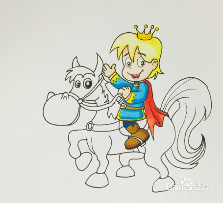 下面开始上色了,用黄色涂王子的头发、皇冠和衣服的花纹,蓝色涂衣服和裤子,披风用红色涂。