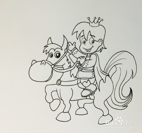 然后画出王子的上身,双手也画出来,一只手拿着缰绳,背后的披风也画出来,褶皱纹理也画上。