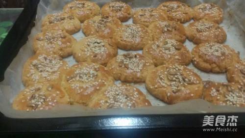 抓一小块面团<即20克>搓圆,用手掌压平面团,用手指在饼面间压一小窝,放入有纸油的烤盘中。并在饼面上刷一层蛋液,撒一层白芝麻、瓜子仁即可烤。