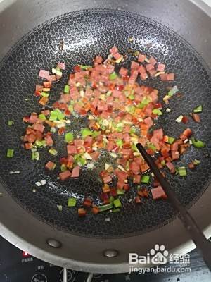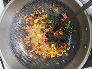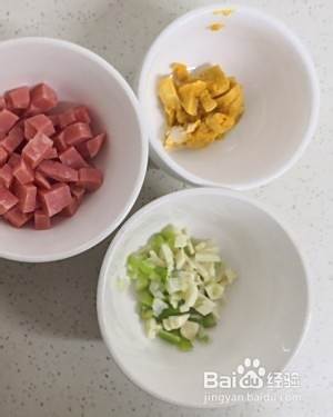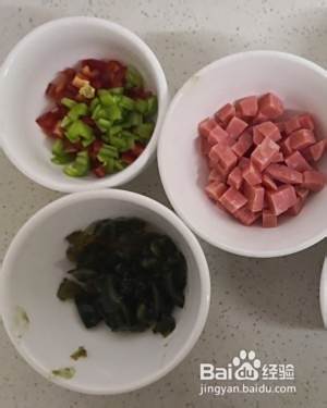 青红椒切丁,皮蛋切成小块,火腿切丁。青红椒和火腿不需要很多,一点就可以了。