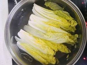 锅中加水,水烧开后放入娃娃菜,不要过度翻拌,翻乱了就不好摆盘了。水中放一点盐和两滴食用油,这样煮出来的青菜颜色好看。菜不要烫太久,稍微变软即可,捞出后在盘中摆整齐。烫完菜的水不要倒掉,后面还要用。