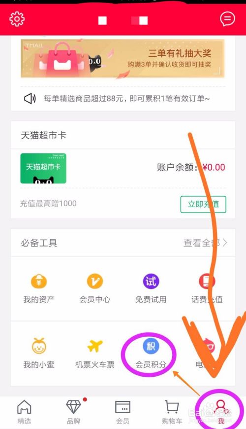打开下载好的天猫APP,登陆淘宝号(也是天猫号,一样的),找到“我”→再找到“会员积分”看图