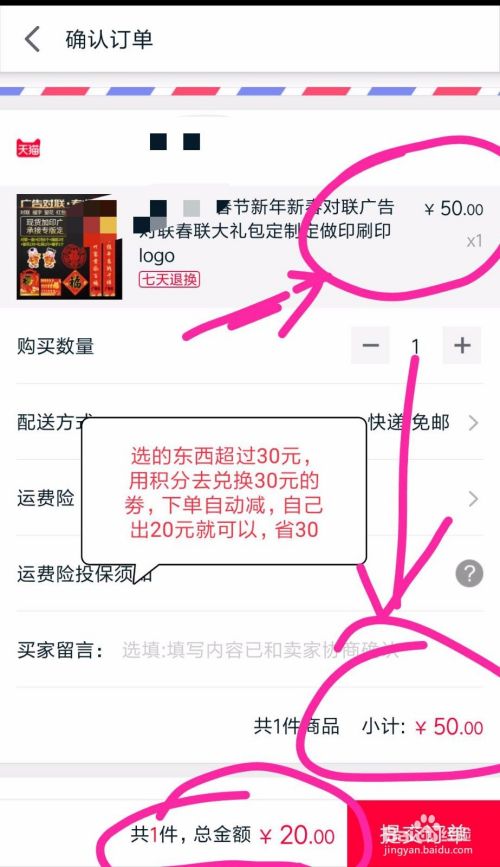 兑换好优惠券,就可以直接去支付自己要买的东西的订单了,看图,“50元”的我兑换了一张30元的劵,最后我自己只要出20元就OK了(记住,要在天猫店铺使用)