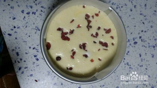 把蛋糊倒进6寸的模具中,震出几个大泡来,沙上些蔓越莓干,(葡萄干或者蓝莓都行)