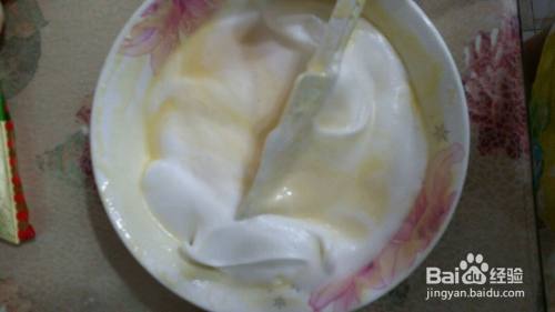 将1/3的蛋白倒入,上下搅拌,不能打圈,会消泡的。再将蛋糊全部倒入蛋白中,搅拌均匀