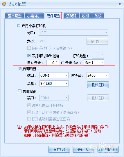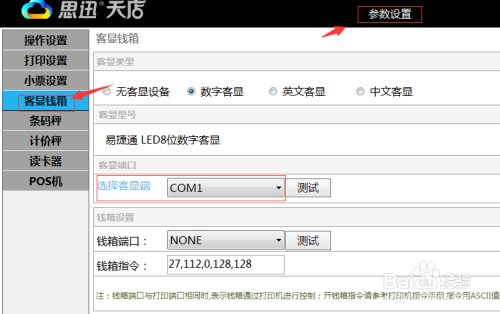 此时需要在收银软件的设置界面里如“硬件配置”、“外部设备”、“参数设置”等,里面的客显设置里选择对应的串口号,如下图统一选择了COM1,然后再操作收银软件进行收银流程。