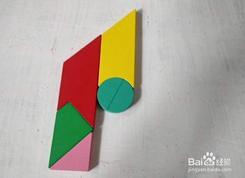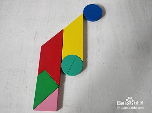 在黄色形状的右上,放上圆形挨着,如图。这样打篮球的人就出来了。