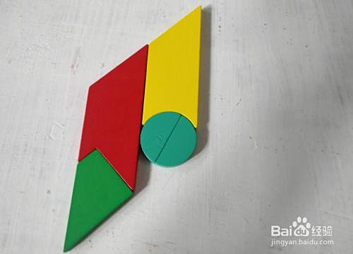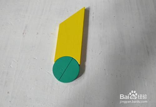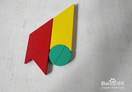 在黄色形状的左侧,放上红色形状挨着,上端一齐,如图。