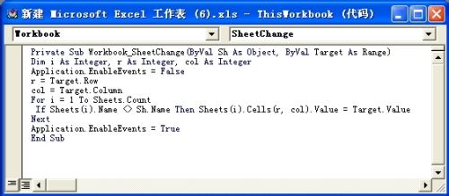 利用 VBA实现当更新工作表单元格内容时,同工作簿下其他工作表相同位置单元格内容同步更新的方法。