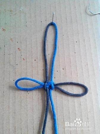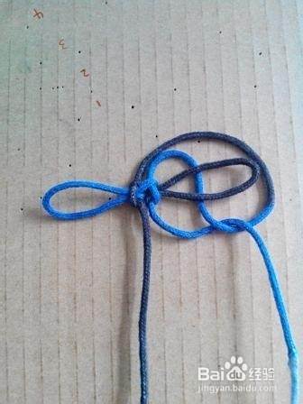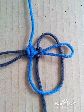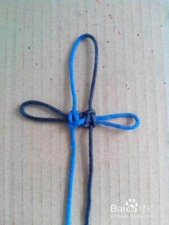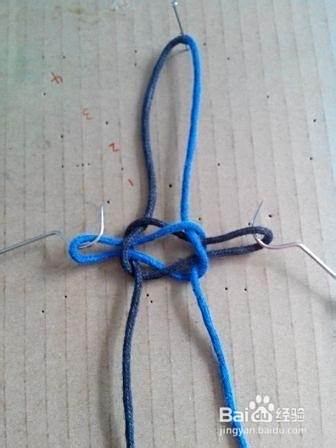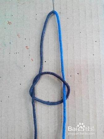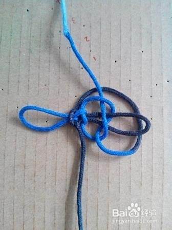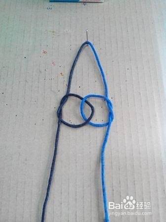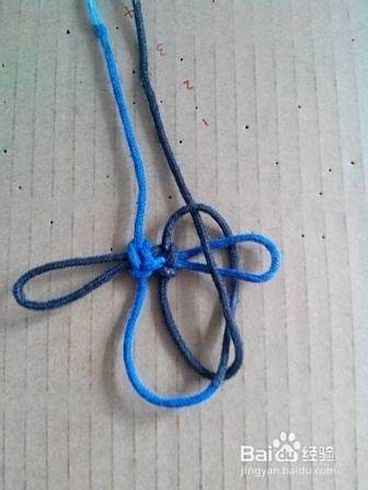 蓝色绳从套中穿过后,和黑色绳一样的方法做一个套,只是方向相反如图。