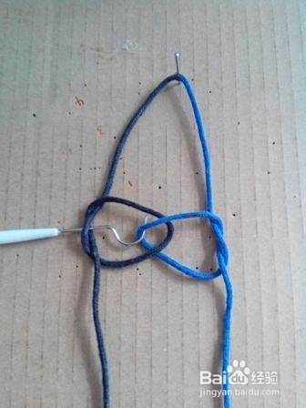 钩针从黑色绳缠绕的位置穿过去,【看图注意穿过的位置】钩住蓝色绳拉出去如图,用同样的办法,把黑色绳也拉出去。