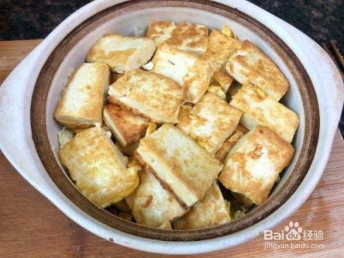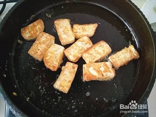 起锅烧油,油温6成放入豆腐煎至两面金黄捞出