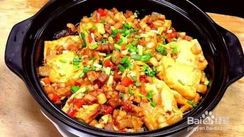 洗净的白菜放入砂锅中,再把煎好的五花肉、豆腐一次铺开