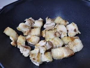五花肉切小块,锅留底油,放入锅中煎至两面金黄