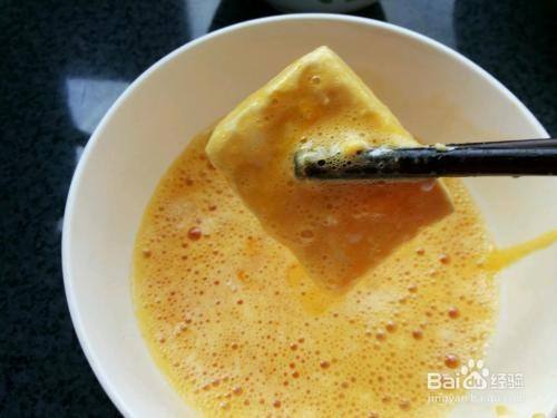 碗中打入一个鸡蛋,搅拌均匀,放入豆腐裹上蛋液