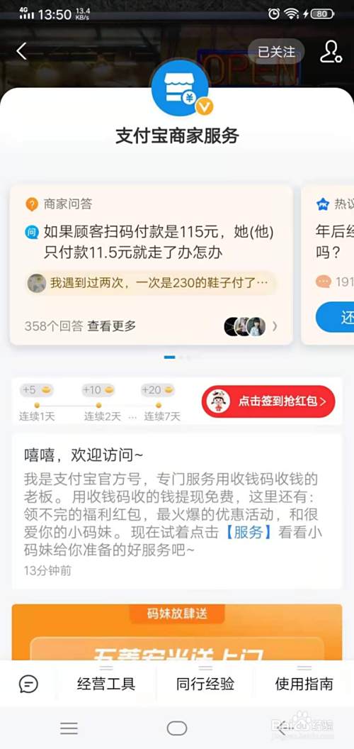 第三步,进入到支付宝商家服务公众号界面后,点击关注它。