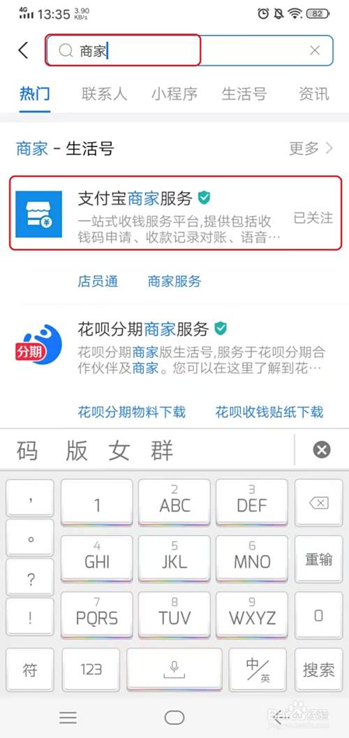 第二步,进入到支付宝的消息界面后,在最顶部的搜索框中输入【商家】两字然后进行搜索。然后在搜索的结果中,点击【支付宝商家服务】公众号。