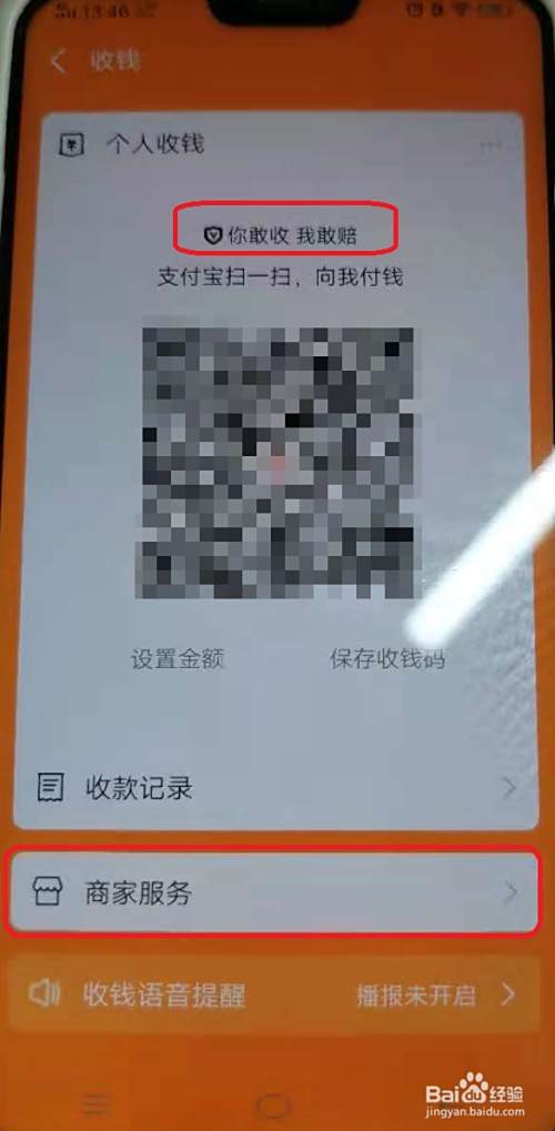 第六步,进入到支付宝的收钱界面后,在收款的界面的最上方,出现【你敢收 我敢赔】的字样,就可以将原有的个人收款二维码替换为商家收款二维码了。