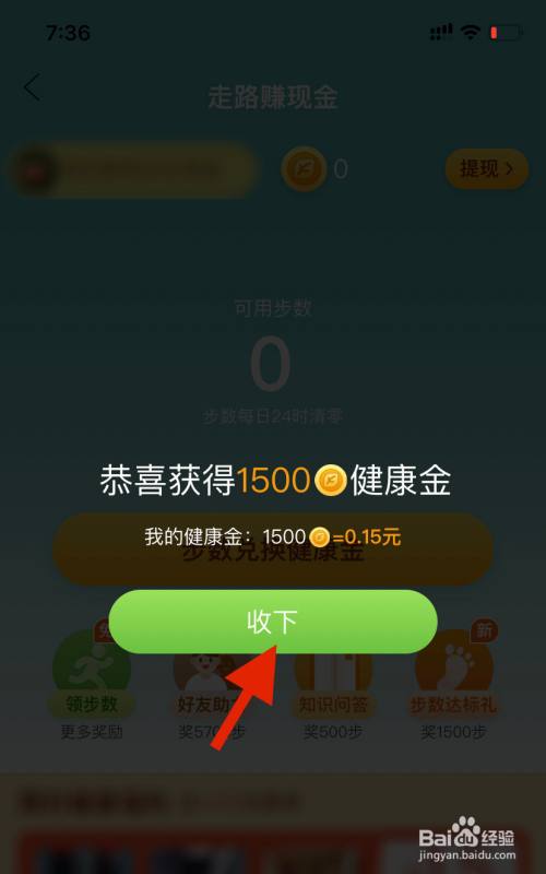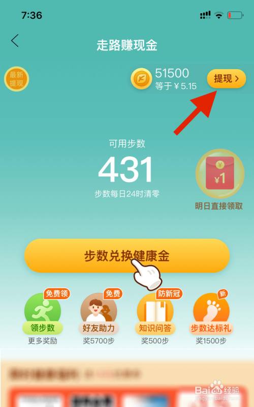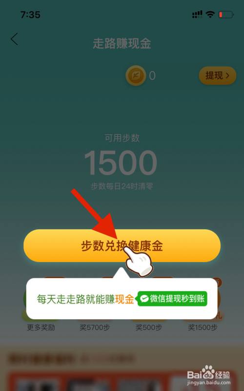 3、点击“步数兑换健康金“。