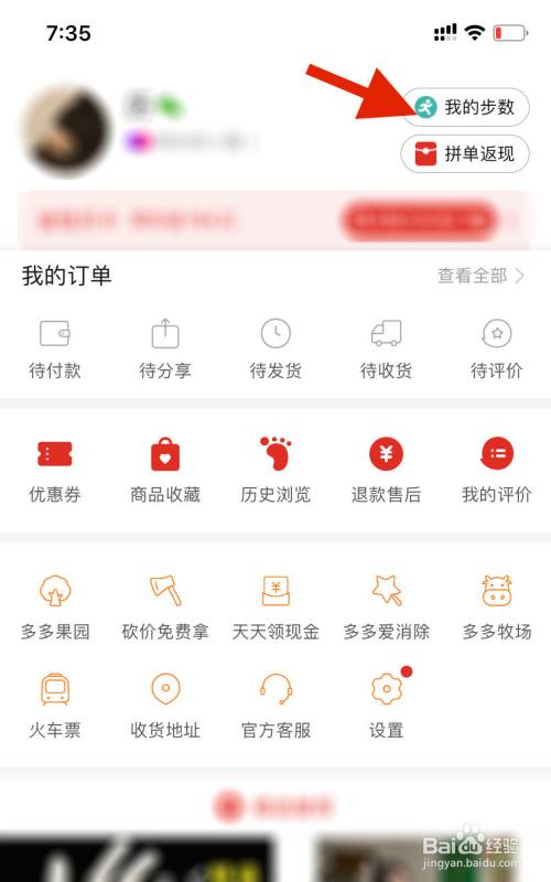在拼多多个人中心页面里,点击右上角的“我的步数”。