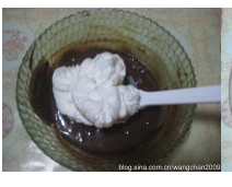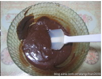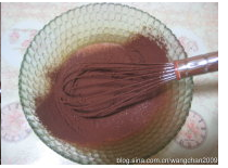 蛋黄加糖打散,加牛奶,油混合,筛入可可粉