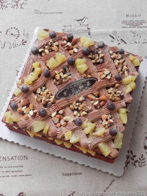 按照原味奶油霜的做法,最后加入巧克力榛子酱,挤在蛋糕表面,用核桃,杏仁,菠萝,巧克力豆装饰,洒防潮糖粉,冷藏保存
