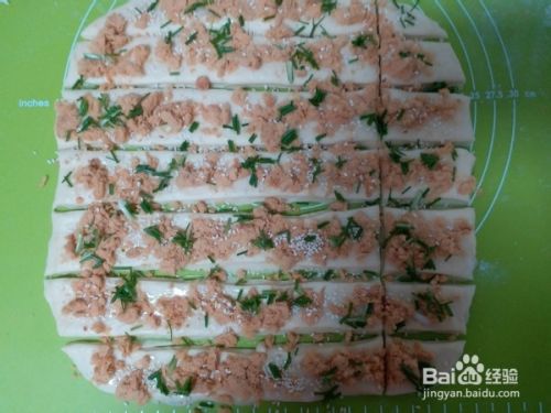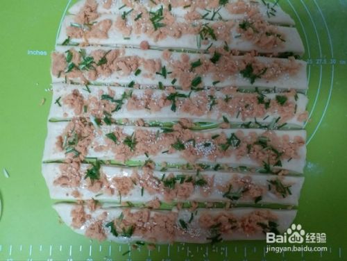 再撒上香葱白芝麻,也可以先在面片撒上肉松肉松,再横切条