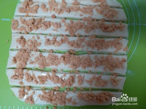 切成横条状,约八条左右,抹上炼乳,撒上肉松,用手掌轻轻按压,以免肉松容易脱落