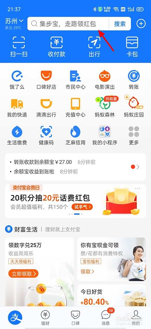 在支付宝首页,点击搜索栏。