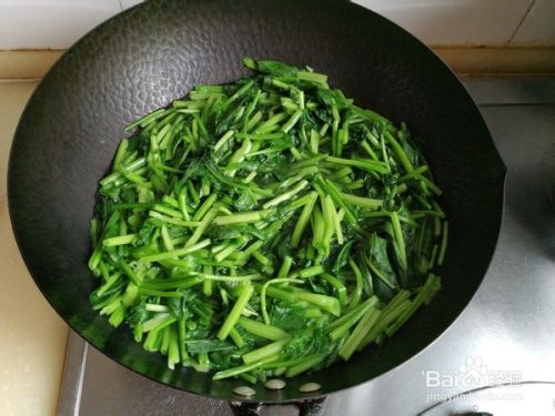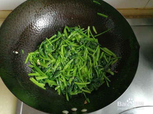 翻炒几下后根据自己口味放入少量盐,并将盐和菠菜炒匀