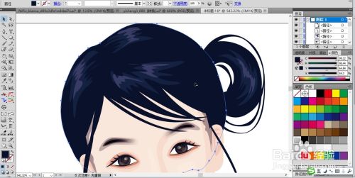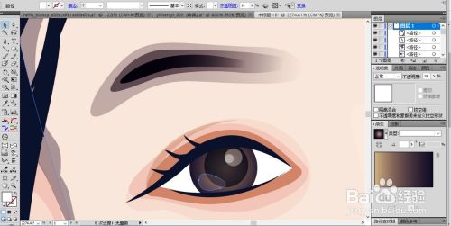 绘制出女孩的眼晴,眉毛用灰黑色的渐变填充暗区,用正片叠底的白色来填充亮区。眼晴用棕色的渐变填充,亮区用多个正片叠底的白色来呈现。眼脸用粉色的渐变来填充。