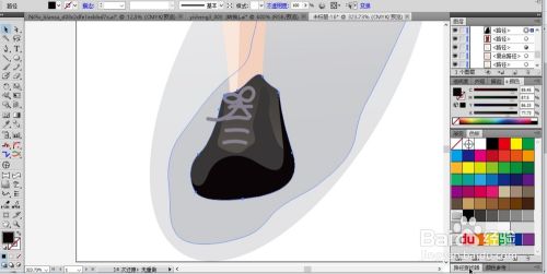 绘制出女孩的鞋子的基本轮廓,我们用灰黑色填充鞋底,再用灰白色填充鞋面的亮区,鞋带也用灰白色来填充。最后,我们绘制出女孩的阴影,我们用灰白色的渐变填充,完成跑步女孩简笔画。