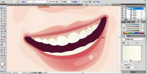 这一步重点画出女孩的嘴唇,我们用粉红色的网格渐变来呈现嘴唇的主体,用粉红色的渐变与灰白色的渐变来呈现牙床与牙齿,用暗红色来填充嘴唇的内部。