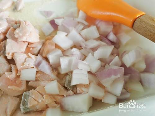 加入三文鱼翻炒变色