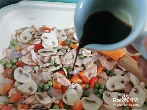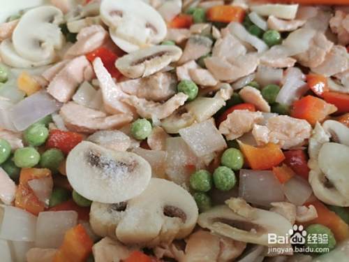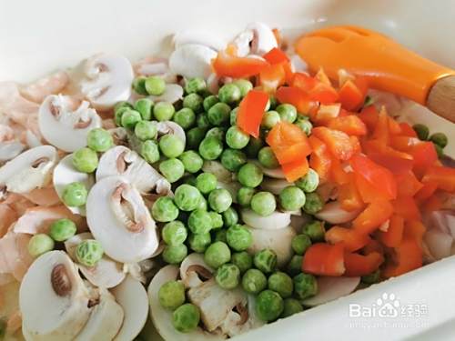 再加入口蘑,豌豆,甜椒,翻炒几下