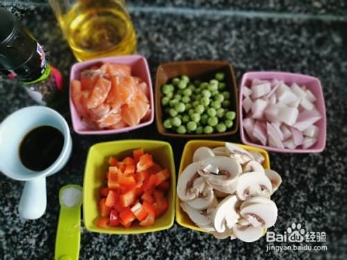 蒸米饭的时间准备配菜,口蘑切片,甜椒和洋葱切丁,三文鱼切小块