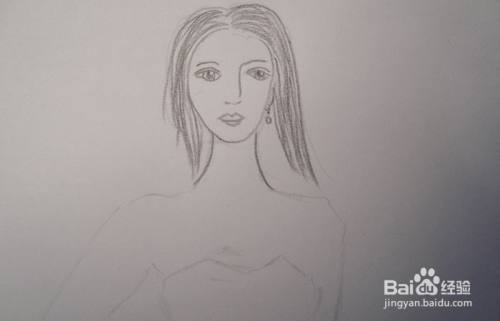 用铅笔在白纸上,画出蓝色晚宴礼服裙的草图,接着用黑色彩铅笔绘画出蓝色晚宴礼服裙的衣领图形,并画出人物头部和头发图形,如下图所示。