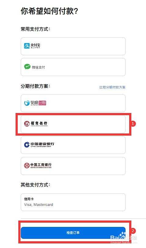 点击/选择【付款方案】,如招商银行,点击【检查订单】;