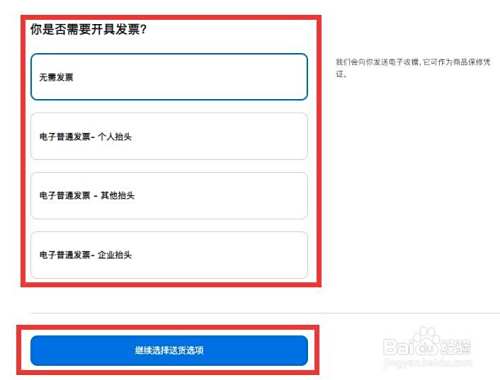 依次输入【送货地址】、【联系方式】,选择【开具发票】后,点击【继续选择送货选项】,如图;