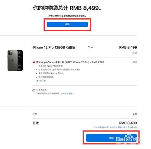 新的页面,点击【查看购物袋】后;点击【结账】,如图;