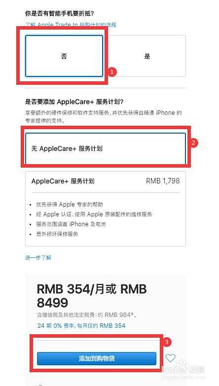 2.依次【选择机型】、【选择外观】、【折抵(如:否)】、【服务计划】后,点击【添加到购物袋】;