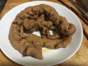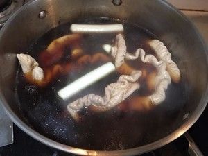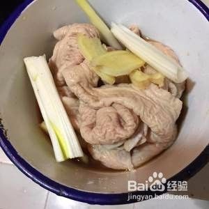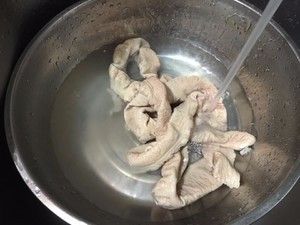肥肠捞出,放入冰水冲洗。这样比较有嚼头。