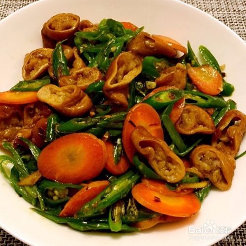 热锅凉油,油多放些,烧热,然后下肥肠大火爆炒。待肥肠边缘微变色把肥肠拨到锅边,锅中间下辣椒,胡萝卜炒出味道,然后将肥肠和辣椒胡萝卜翻炒在一起,加盐,一点老抽上色,根据口味加入鸡精或者味精,出锅即可。