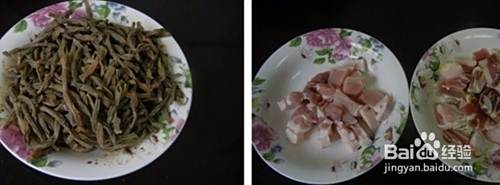 五花肉洗净切块,咸肉用开水泡一下,切片.