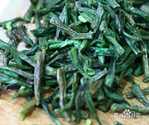 蒜拍碎后切成末、干红辣椒切小段,豇豆干提前浸泡、洗净、切段,青蒜取叶切段
