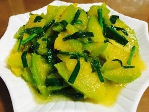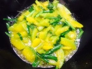 等底部水快干的时候,可以尝一下南瓜熟了就行,放盐和韭菜,翻炒几下,加点鸡精(介意可不放)