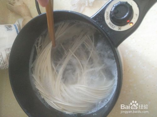 等面条变软时,使用筷子将面条都放到锅里。